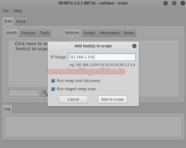 To scan our target we will use Sparta. Sparta is combination of nmap scanning and Nikto. It makes our work simpler. To open Sparta, Open kali linux > Applications > Information Gathering > Sparta. After opening Sparta, click on where it says "click here to add host to scope". A dailog box will open asking target's IP. Give your target' IP there and click on add scope.