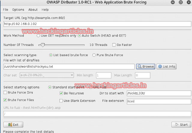 Open DirBuster, give target's IP and the path of dictionary file named rockyou.txt