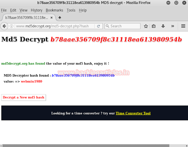 As you can see that the password is in MD5 hash value. We can crack it online no third party tool is needed. Simply go to www.md5decrypt.org
