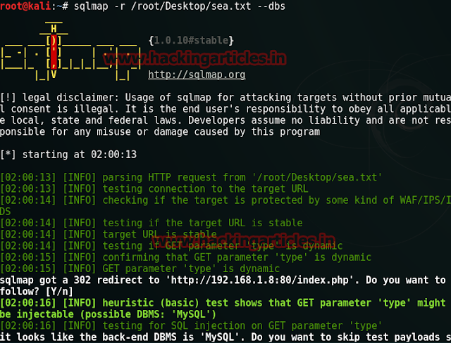 Then start the SQL attack by typing the following command in the terminal of Kali.