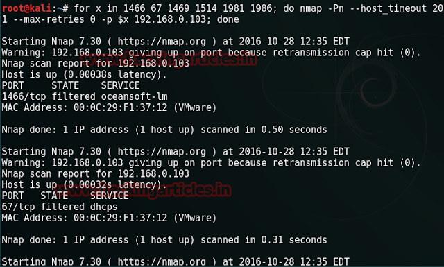 For x in 1466 67 1468 1514 1981 1986; do nmap –Pn –host_timeout 201 –max-retries 0 –p $x 192.168.0.103; done