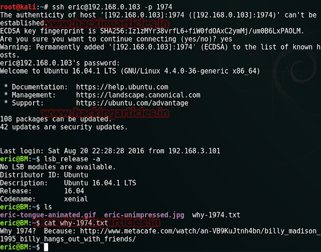 And Voila!! FTP port opened on 21. Lets’ enter through it now as we have username and password. Remember The password and username for eric we discovered earlier.
