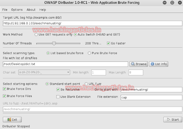 Execution of the above command will create a text file with names veronica in it. Now use this text file and find the file which had veronica in it through DirBuster. And for this, open DirBuster and give the URL in the Target URL text box and then give the path of the text file you just created using grep command. Give the directory name in Dir to start with text boxand then give cap as the file extension.