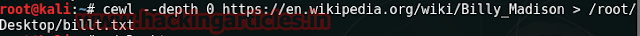 cewl –depth 0 https://en.wikipedia.org/wiki/Billy_Madison> /root/Desktop/billt.txt