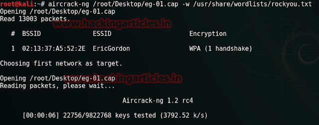 aircrack-ng /root/Desktop/eg-01.cap –w /usr/share/wordlists/rockyou.txt