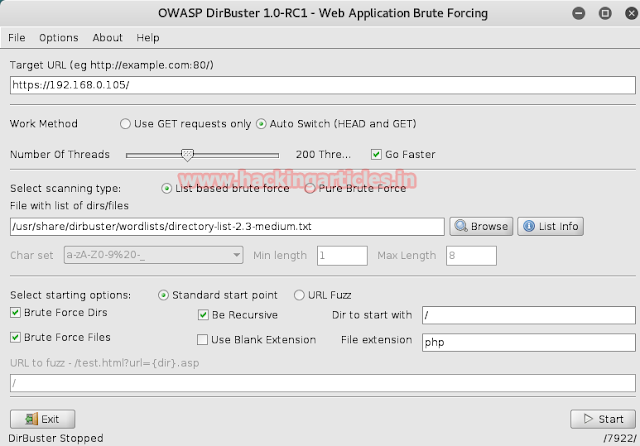 Aer making lots of efforts I decided to use dirbuster to seek inside the directory of target. Type dirbuster on terminal and automatically OWASP dirbuster window gets open. Here browse your dictionary from /usr/share/dirbuster/wordlists and choose your appropriate wordlist as I select medium.txt, do not forget to address target URL in top of text field as: http//192.168.0.105 and finally hit start button.