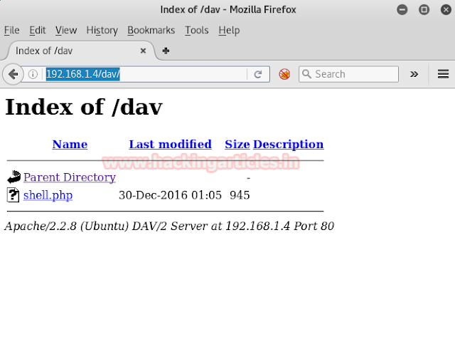 To verify that file is uploaded or not, make URL: 192.168.1.4/dav run on browser. Congrats!!!We got our file shell.php on web server.