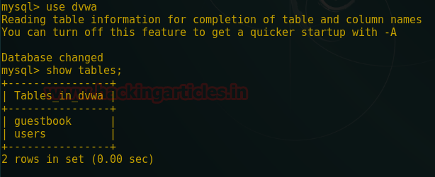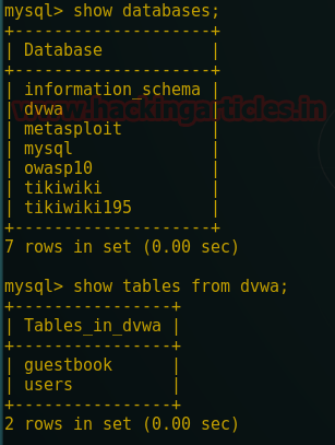 it has shown all databases name present inside it. Let’s check the tables inside the dvwa.