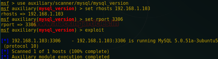 msf auxiliary(mysql_version) > set rhosts 192.168.1.103