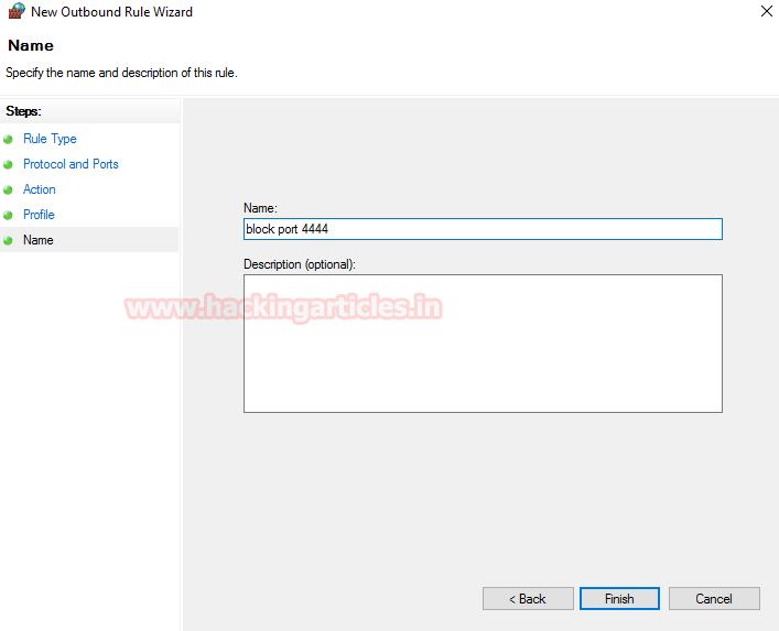 Here give the name to your own specified rule. You can see in the screenshot I had named it block port 4444 and then click on finished.