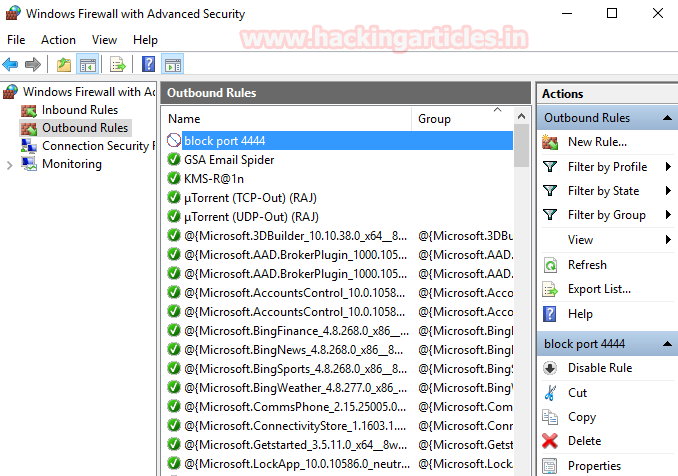 Here you can see the new outbound rule is added into the list of outbound rules. Hence victim has defense himself from establishing connection with port 4444, now if attacker try to connect with victim through port 4444 then it might be possible that attacker doesn’t receive any reverse connection.