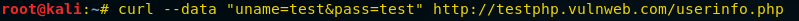 Curl -data “uname=test&pass=test” http://testphp.vulnweb.com/userinfo.php