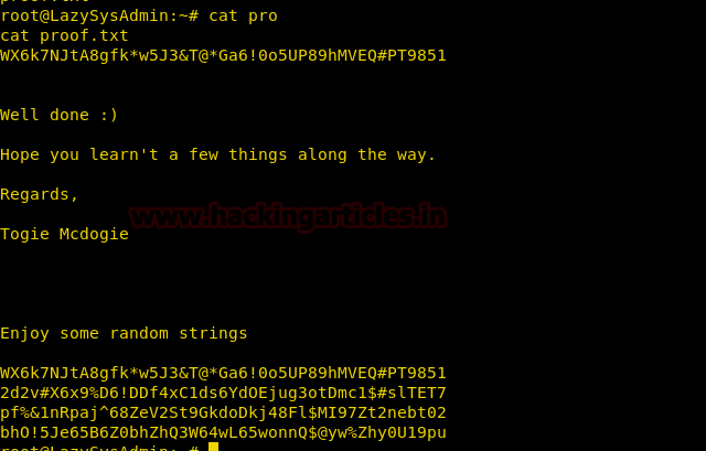 So we switch to root and go into root folder. There we find a file called proof.txt, we open the file and are greeted with a message congratulating for the completion of the CTF challenge.