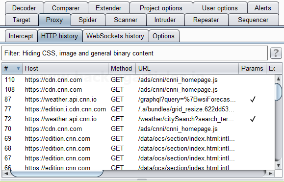 Click on HTTP History Tab under the ProxyTab, where we see that the website has made 122HTTPGETrequests. These requests are generated without any extension enabled.