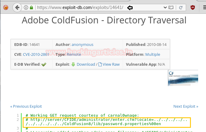 So when I Google I found exploit 14641 Adobe Cold Fusion is vulnerable to Directory Traversal then I copied the highlighted text which indicates ColdFusion 8 also stores the administrator hash locally in a file password. Properties.