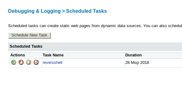 Using admin:happyday as login credential I logged into admin console and choose scheduled tasks option from inside Debugging & logging for scheduling new task as shown below in image