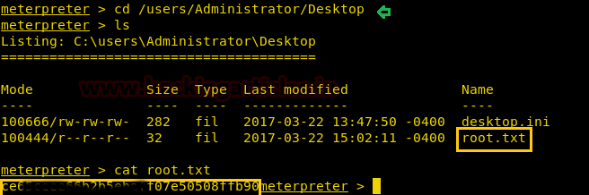 Similarly after traversing so many directories I got root.txt from inside users/Administrator/Desktopand use cat command for reading.