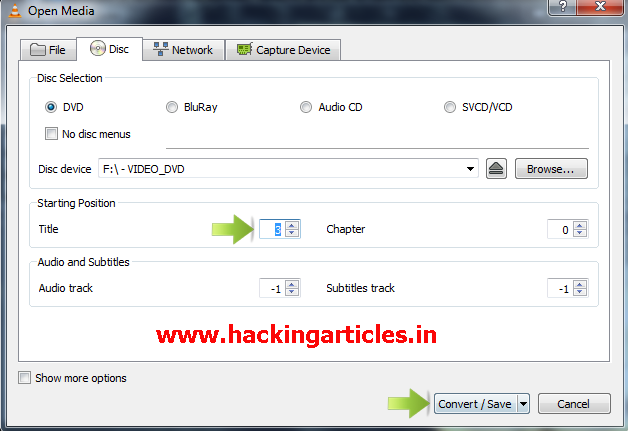 Open the Disc option, enter the title number i.e the number at which that particular video is located, then select Convert/Save.