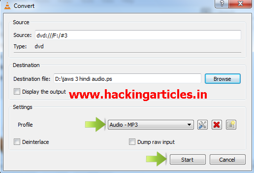 Browse the Destination file, change the Profile Settings i.e Audio-MP3 and then select Start.