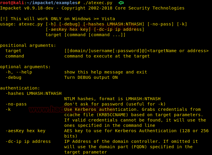 Syntax: /atexec.py [[domain/] username [: password] @] [Target IP Address] [Command]