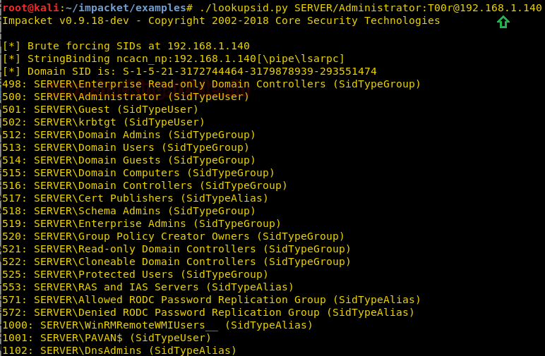./lookupsid.py SERVER/Administrator: T00r@192.168.1.140