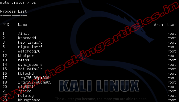 The ‘ps’ command displays a list of running processes on the target.